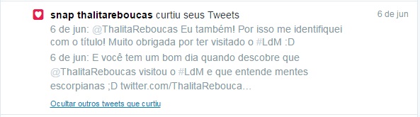 Foi muito rápido o bate-papo, contei pra ela que o Confissões de uma garota excluída, mal-amada e (um pouco) dramática me ganhou no título, que é extremamente escorpiano. E agradeci a visita ao Literatura de Mulherzinha porque ela comentou no Twitter o detalhe que só estava no texto. Foi extremamente gentil e desejei que ela voltasse mais a Juiz de Fora, sem pneus estourados! Ela disse que gostou da cidade:)
