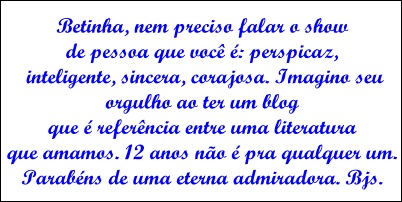 Uma mensagem linda de bloggversário, muito carinhosa em sua simplicidade, pensada para você !!! Ela tem razão: seu blogg é mesmo uma referência pra aprender, pra divertir, pra emocionar, pra rir, pra rir de novo. Eu continuo adorando suas postagens indignadas ou mal-humoradas porque elas são muito mais caprichadas e vêm de seu coração muito mais diretamente ! Foi uma mensagem linda mesmo de bloggversário !