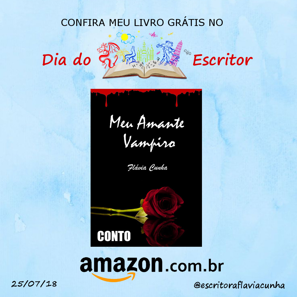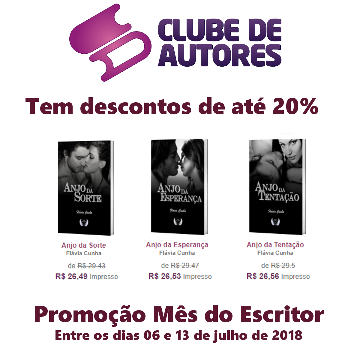 O Dia do Escritor está chegando e o Clube de Autores está com uma super promoção! Entre os dias 06 e 13 de julho todos os livros impressos da @escritoraflaviacunha (inclusive as edições especiais com 2, 3 ou 4 histórias) vão estar com 20% de desconto!